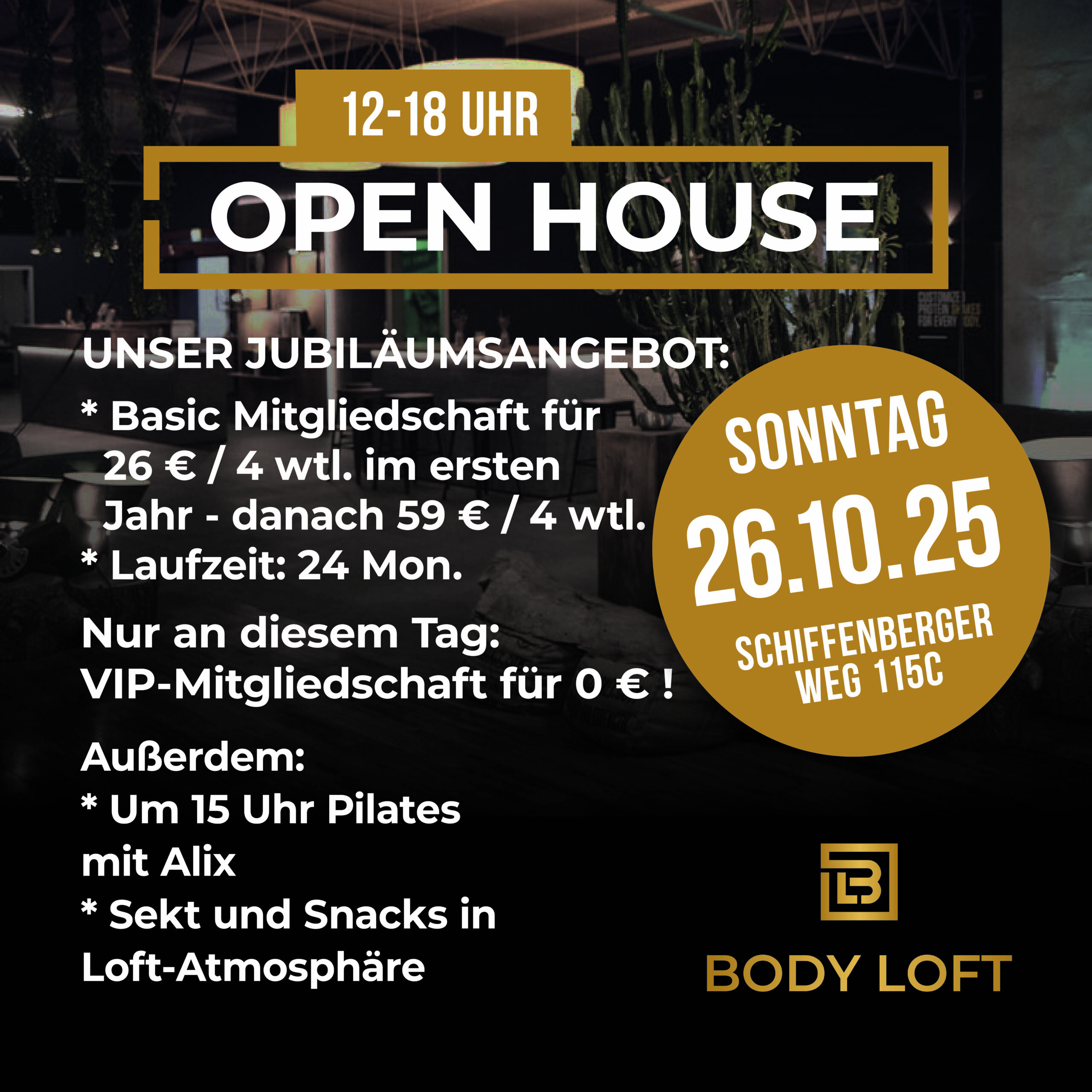Am Sonntag, den 26.10.2025 laden wir ganz herzlich zu uns ins BodyLoft ein - die Türen sind von 12-18 Uhr für alle geöffnet, die sich für Fitness, Gesundheit & Wellness interessieren und sich unser schönes Studio mal anschauen möchten.